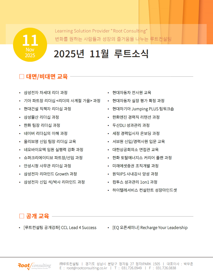 게시판 내용 2025년 11월 루트소식 관리자 조회수 : 21 | 2025-10-31 안녕하세요. 루트컨설팅입니다.2025년 11월 루트컨설팅 소식 안내드립니다. ▶️ 루트컨설팅 월간 세미나 신청하기 (클릭✓)
