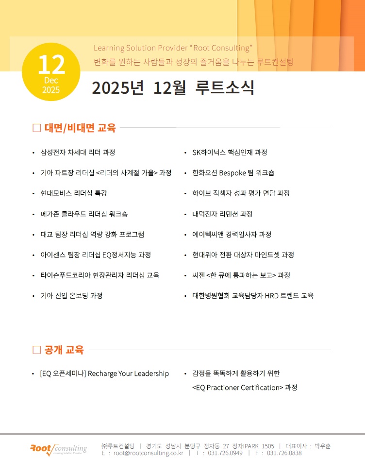 게시판 내용 2025년 12월 루트소식 관리자 조회수 : 2 | 2025-12-02 안녕하세요. 루트컨설팅입니다.2025년 12월 루트컨설팅 소식 안내드립니다. ▶️ 루트컨설팅 월간 세미나 신청하기 (클릭✓)